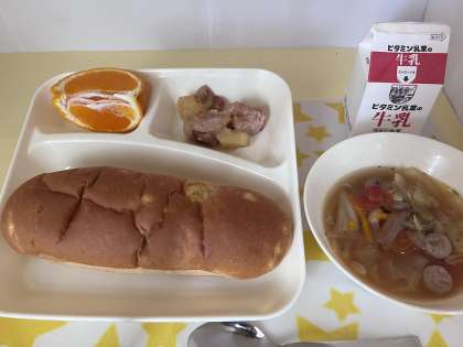 【おさつパン、牛乳、鶏肉とじゃがいものガーリック焼き、