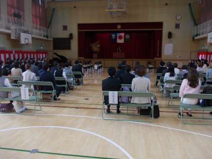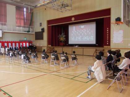 校長先生、PTA会長から『お祝いの言葉』をいただき、新2年生からはビデオで「歓迎の言葉や歌」が贈られました。教室に戻ると、担任の先生が一人ひとり名前を呼び、ここでもまた元気に返事をしていました。
