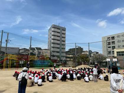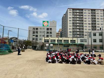 初めて取り組む1年生も、先生の指示をよく聞いて、ハンカチで口をおさえて避難していました。全員の避難が、スムーズに行われ、また、運動場でのお話も、真剣に聞いていて、担当の先生や校長先生にほめていただきました。