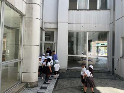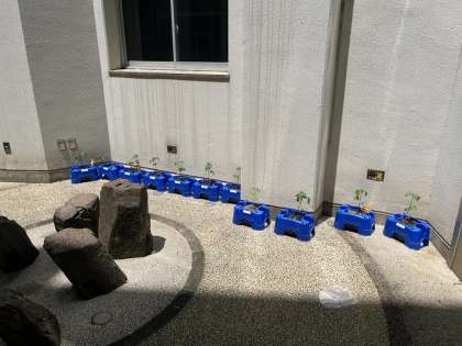 2年生が、届いたばかりのミニトマトの苗を、自分の鉢に移し、強風などの対策のため、中庭部分に鉢をお引越しさせていました。管理作業員さんが、アドバイスと誘導をしてくださいました。
