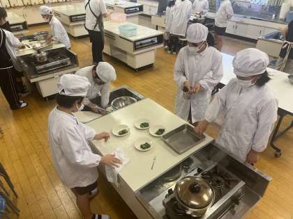 黒板に書かれた手順をよく読み、先生の話をよく聞き、班のみんなで分担、協力しながら、ほうれん草と、じゃがいもをゆでて、おいしくいただきました。