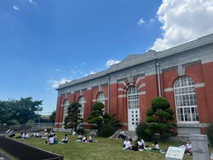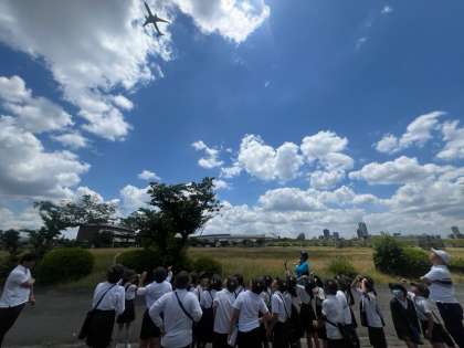 敷地内に大きな芝生が広がっていましたが、この地下は広大な貯水池になっているそうです。お話の途中、伊丹空港へ降りたつ飛行機が真上を飛んでいきました。
