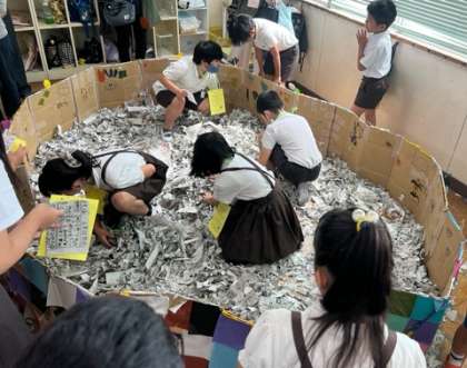 各クラスごとに用意したアイディアいっぱいのお店を、1〜6年生、たてわりで編成したグループでまわります。
