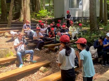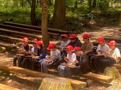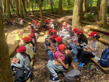 森に囲まれて、仲間とともに、昼食をいただいています。