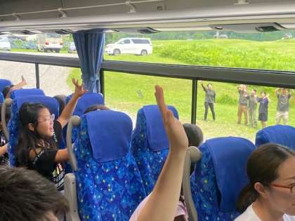 12:25ごろハチ高原を出発しました。窓の向こうで、宿舎の皆様が大きく手を振ってくれていました。