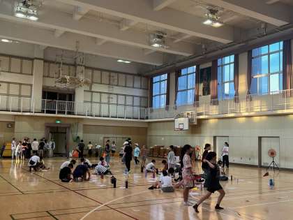 夕暮れのかき氷で涼しくなって、自然と紙飛行機を飛ばす練習が始まりました。