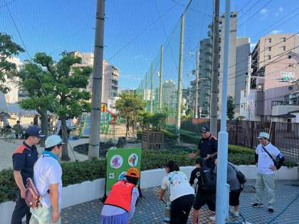 その後、正門付近で消火訓練が行われました。東成消防署の方のアドバイスをよく聞き、放水タイプにアレンジされた消火器を扱い、水を的に上手にあてていました。