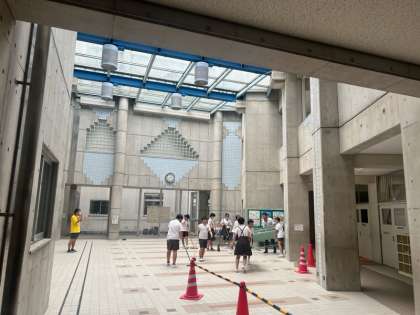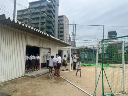 この時間、雨はやんでいましたが、運動場の状態がよくなく、テント、長机、長椅子などはいったん、ピロティや通路に準備をしました。
