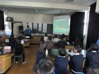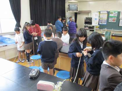 1月13日(水)に4年生の環境学習出前授業があり、大阪市環境局の方、一般法人あだーじょの方、ひがしなりわがまちくらぶの方が来てくださいました。平野川の水の汚れから始まって、生息する魚の実態などについて教えていただきました。最後に、環境に優しいアクリルたわしの作り方を教えていただき、みんなで作りました。