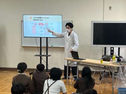 「薬を水以外で飲んだとき」の効果がわかる実験や、スライドショーを使ったご説明で、「薬を正しく使うこと」の大切さがわかりました。