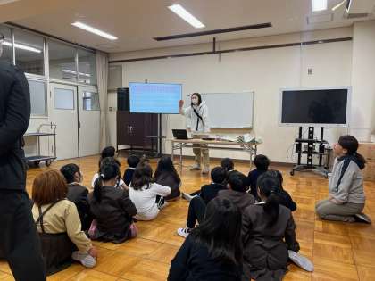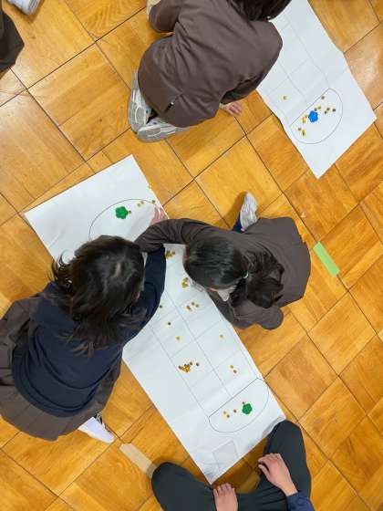 担当の先生からスライドショーを交えていろんなお話を聞き、ベトナムの文化について知りました。その後は、ベトナムの遊び「オー・アン・クアン」という、石(こま)を使って、数を競うゲームに取り組み、盛り上がりました。