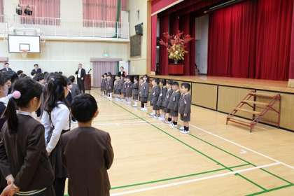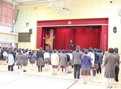 始業式では、校長より、「優しい心を大切にする」「あいさつ名人になる」「チャレンジする」ことを頑張ってほしいという話がありました。式中の子どもたちの校歌が、とても上手な歌声で心に響きました。
