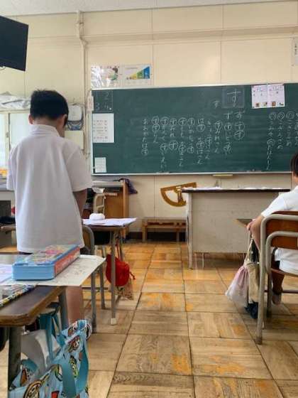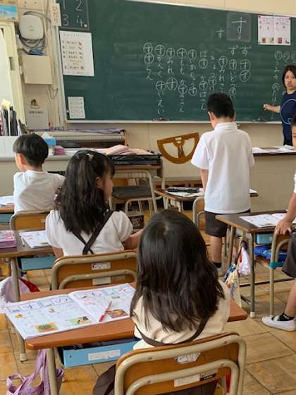 1年生は、ひらがなを1つ1つ丁寧に教えてもらっています。今日は、「の」と「す」を学習しました。「の」のつく言葉、「す」のつく言葉を考えて発表します。先生とみんなで、言葉を確認することで、語彙も増えていきます。「の」のつく言葉、「す」のつく言葉を見つけることや発表することを楽しんでいました。