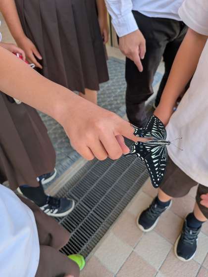羽化したところなので、子どもたちは、慎重に校庭まで連れてきてあげていました。仲間同士で、羽化を喜び分かち合う姿が、ほほえましかったです。