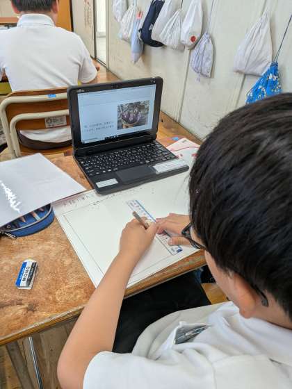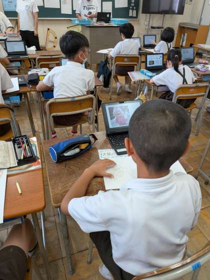 4年生の社会科は、大阪の名産調べをしています。水茄子などの食べ物、ミャクミャクなどのキャラクターをインターネットで調べてまとめています。
