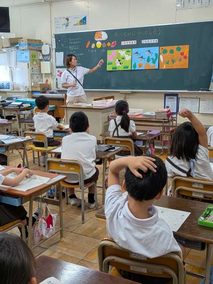 「いただきます」「ごちそうさまでした」は、何のために言うのかなど教わりました。先生からの質問に、どんどん積極的に手を挙げて答える子どもたちの姿がたくさん見られました。