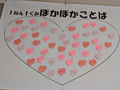 1年生の教室には、「ぽかぽかことば」が、掲示されています。これは、文字通り、心がぽかぽかする温かい言葉です。