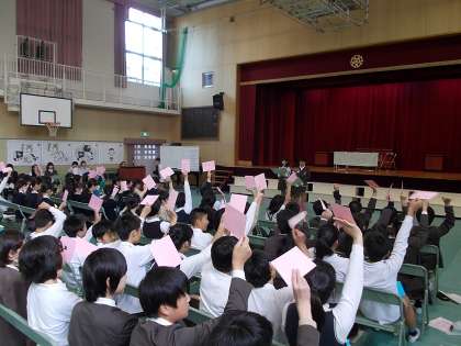 3月8日に学校保健委員会が行われました。保健委員会の子どもたちが「早寝」「早起き」「朝ごはん」「夜の歯みがき」「よく遊ぶ」ことについて1年間にわたって調べた結果をもとに、劇やクイズで発表してくれました。最後に、学校医の大庭先生や多羅先生からもお褒めの言葉を頂きました。