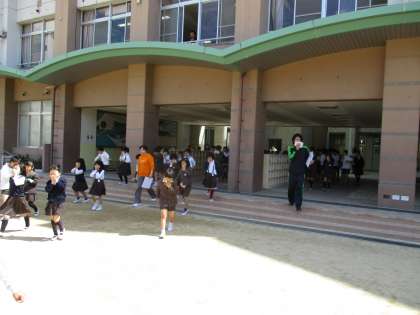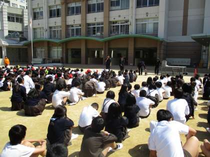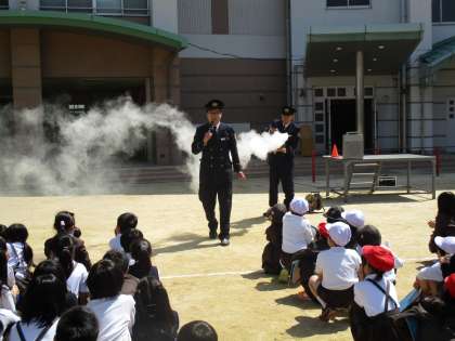 避難訓練を行いました。消防署の方に来ていただき、避難訓練の様子を見守ってくださいました。とても早く、静かに集まれたとお褒めの言葉をいただきました。また、昨日九州であった大きな地震のことにも触れられ、火や煙が出たときの行動の仕方を実際に煙(人工的に作った安全なもの)を出して説明してくださいました。みんな真剣に聞いていました。