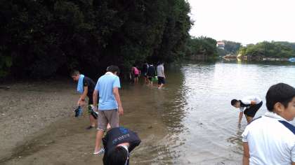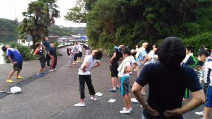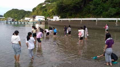 2日目の朝です。ホテル内の砂浜前の広場で、朝の会、体操を終えた後、砂浜で磯歩きを楽しみました。