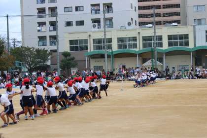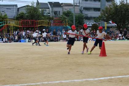 中学年。団体演技「地球の泣き笑い〜行動しよう地球人〜」、3年綱引き、4年台風の目。