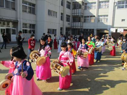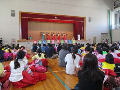 第20回東部子ども民族文化祭が行われました。初めに、舎利寺小学校から桃谷高校までパレードをして、次に桃谷高校の運動場で全体プンムルを行い、そのあと体育館でいくつかの学校の発表を観ました。大成小学校からは、11名の子どもたちが出席をしました。いろいろな学校の歌や踊りを観て、楽しく勉強ができました。
