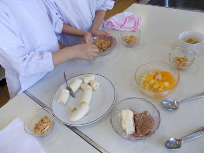 実習が始まってみると、みんなで協力し、とってもおいしいパフェが出来上がりました。