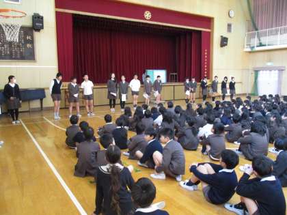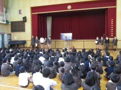 児童集会がありました。今日は、図書委員会の発表です。図書室の使い方・図書の分類の説明・本を大切に使うことや、図書館補助員さんがテーマをきめて興味のわくような展示や掲示をしてくだっさっていることの紹介を、大きなディスプレイに映しながら図書委員の児童たちがわかりやすく発表していました。見ている児童たちも、うなづきながら真剣に聞き入っていました。使いやすい気持ちの良い図書室で、いろいろな分野の本をたくさん読んでほしいものです。みなさん、図書室をもっと利用して、たくさんの本を読み、心に栄養を与えましょう!