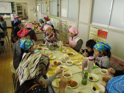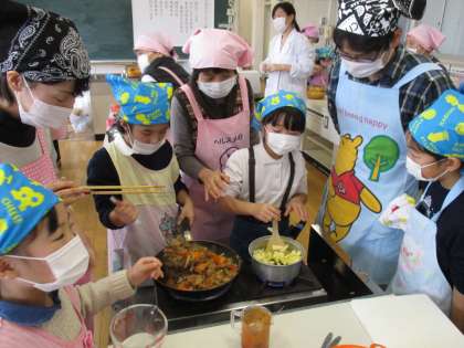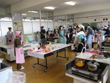 本校家庭科室でPTAファミリー料理教室が行われました。東成区の食生活改善推進委員の方10名が指導者になり、お父さんやお母さん、お子さんに調理の仕方や料理のコツを丁寧に教えてくださいました。和気あいあいとした雰囲気の中「もろこしごはん」「揚げない酢豚」「豚汁」「簡単リンゴパイ」が次々と出来上がりました。3世代同居の家庭が少なくなってきている昨今、食事をしながらいろいろな年代の方とお話をすることで、普段の料理の話だけにとどまらず、子育てについての話まで盛り上がり、大変充実した楽しい1日でした。