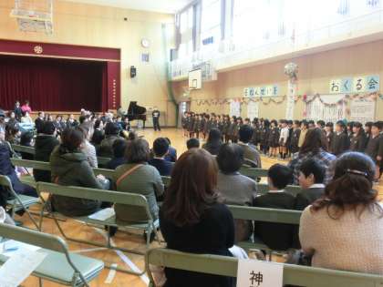 2月25日(火)大成小学校で、東成区「特別支援学級・6年生を送る会」が行われました。6年生児童の紹介の後、みんなで力を合わせて、くす玉を割りました。中から「おめでとう」の文字が出てきて、みんな大喜びでした。保護者の皆様、各学校の校長先生や担当の先生方など多くの方々が来られ盛大に開催されました。また、大成小学校の1年生から、お祝いの歌や呼びかけがあり、とても楽しい雰囲気になりました。