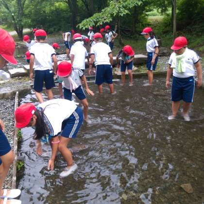雨が降りだす前に、魚つかみを行いました。なかなか、うまくつかめず、悪戦苦闘しました。その後、雨が降ってきたので、急いで帰りました。