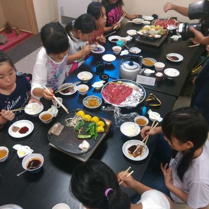 今日の夕食は、鉄板焼きです。朝からいろいろな活動をしたので、みんなお腹がペコペコです。