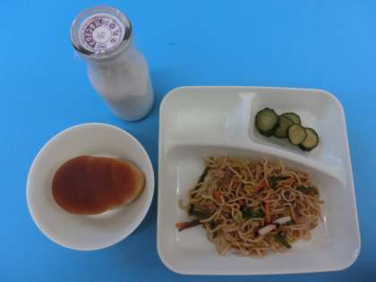 今日は黒糖ロールパン、牛乳、焼きそば、きゅうりのピリ辛あえでした。