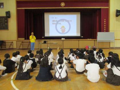本日2時間目に、東成区役所のまちづくり推進課地域安全防犯(あんパト)の方が3年生の子どもに「防犯教室」を行ってくださいました。「クイズ」や「防犯ブザーのお話」「不審者対応」など楽しく防犯についての学習を行いました。子どもたちは一生懸命お話を聞き、これから気を付けることを理解できたようです。