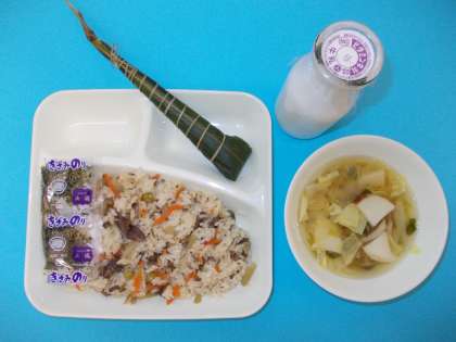 牛肉のきんぴらちらし、牛乳、五目汁、ちまきです。
