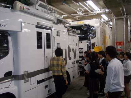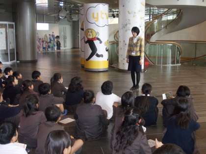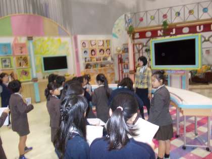 今日は、五年生が社会見学で京橋の読売テレビに行きました。玄関前のコナン像を見て、「わあ〜コナン君の像や〜。読売テレビや。」と言ったり、説明を聞いて、スタジオの中を見学したり、中継車の中を見せてもらったりしました。「案外、スタジオってせまいなぁ。ライトがいっぱいあるわぁ。」「中継車の中って機械だらけや。」と感想をいいながら普段は見ることのできないテレビ局の中をしっかりと見学していました。