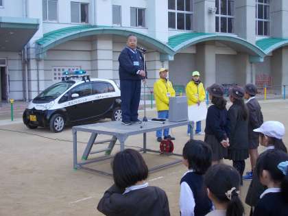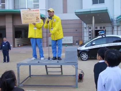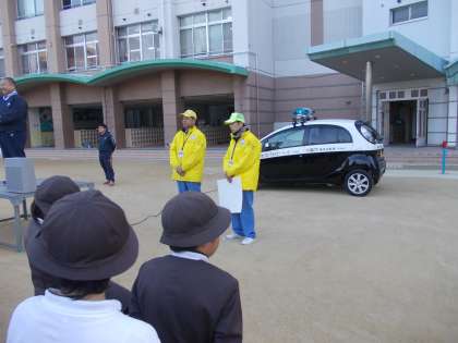 本日、全校朝会のときに地域安全パトロール隊の方が来られて、防犯・安全についてお話をしてくださいました。5つの約束や青色パトロール車のことなどわかりやすく話ししてくださいました。子ども達は、実際の青色パトカーを見ながらしっかりと話を聞いていました。