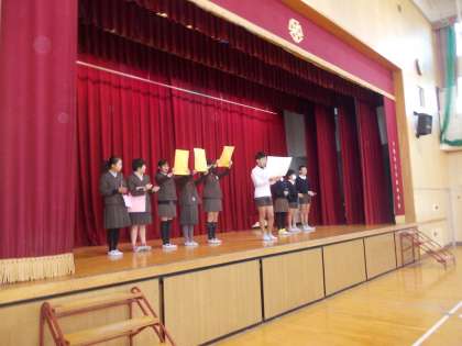 今学期になって、毎週木曜日に英語のモジュール活動があり、英語に親しむ活動を行っています。本日は、全学年講堂に集まって、英語集会が行われました。全員で、舞台のアルファベット文字を見ながら、手拍子を打って英語の歌を歌ったりしていました。
