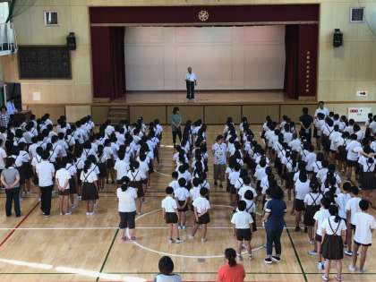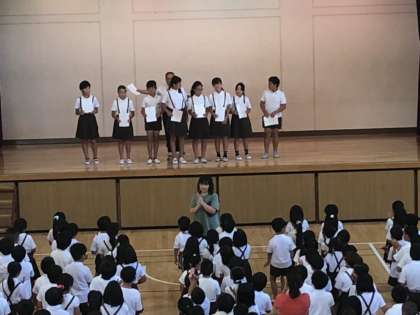 始業式では、水泳記録会で頑張った子どもたちが、校長先生から表彰状を授与されていました。