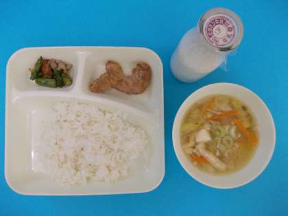 今日はごはん、牛乳、鶏肉のしょうゆバター焼き、五目汁、グリーンアスパラガスのいためものでした。