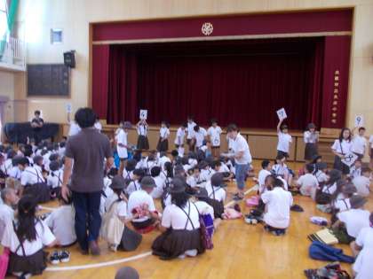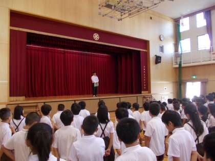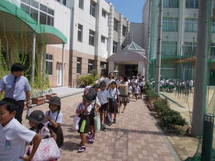 8月30日(土)から第2学期が始まりました。土曜授業として、台風の避難訓練もありました。町会単位で講堂に集合し、見に来られた保護者の方々と一緒に集団下校しました。