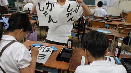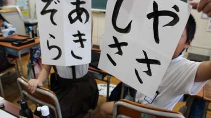 5年生は、習字でひらがな4文字のことばにチャレンジしていました。ひらがなの曲線やバランスは、意外と難しいものです。出来栄えを先生や友だちと確認し合いながら、がんばっていました。どの子にも、素敵な文字、素敵な一画、素敵なとめ、はね、はらいがありました。