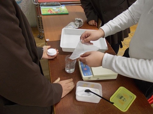 5年生の理科は、「ものの溶け方」の単元です。今日は、「ものの溶ける量」を調べました。薬包紙に2mgずつ取り、50mlの水に、食塩がどれだけ溶けるのかを調べました。食塩を2mg入れては、シャカシャカとバーテンダーのように、シェイクをがんばっていました。ポイントは、掌の体温で水を温めてしまわないことです。大体、16mg溶けたところで溶け切らなくなったようです。次回は、溶かすものを「ミョウバン」に変えて実験です。今回のように、グループで協力して進め、学びを深めてほしいです。