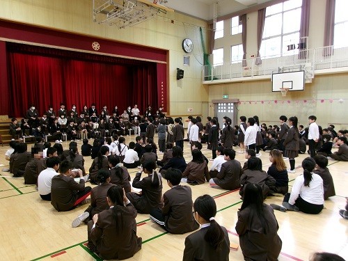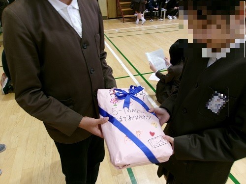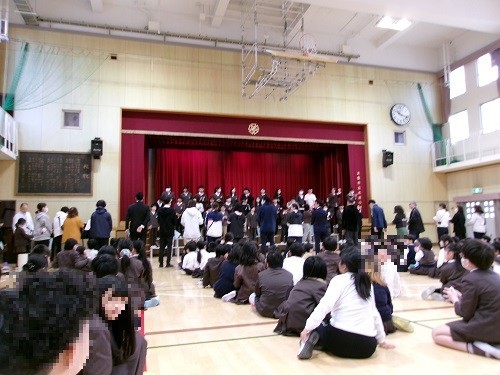 今日は、2時間目、3時間に「卒業を祝う会」がありました。プラカードを持った5年生児童が、卒業生を入場時にナビゲートしてくれ、在校生・教職員で拍手で迎えました。6年生にまつわるクイズをみんなで楽しんだ後は、各学年からの歌の贈り物、教職員の歌の贈り物、そして卒業生から在校生への歌や雑巾のプレゼントなどがありました。途中、感極まる児童や教職員の方もおられ、感動いっぱいの温かい「卒業を祝う会」となりました。しっかりと下級生の模範となって、がんばってくれた6年生です。残りわずかですが、最後まで良い姿を下級生に示してくれるのではないかと思います。午後からの茶話会は、6年生児童全員参加で、お菓子やジュースをいただきながら、担任の先生らとほのぼのと楽しい時間を過ごしました。また一つ、小学校生活の良い思い出ができたことと思います。