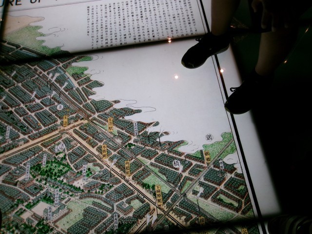 足元に広がる大きな古地図をのぞき込み、昔の大阪の地形や道の位置を確認しました。大阪城や、校区のすぐ隣、鶴橋駅など確認できました。