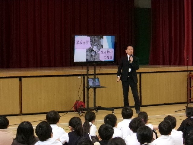 校長からは、上級生が新入生に対して、まるで弟や妹のように優しく接している姿や、これまでと変わらずあいさつを頑張っている姿など、子どもたちの良さに触れる話がありました。また、「胴咲き桜」の話を通して、日々努力を積み重ねることの大切さについても伝えられました。