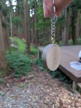 木のキーホルダー作りの様子です。梅、柿、欅の木から、お好みの木を選びます。砂ヤス...