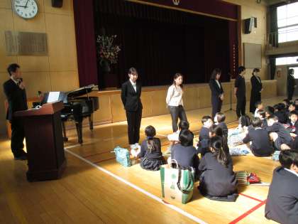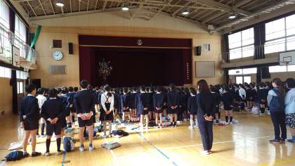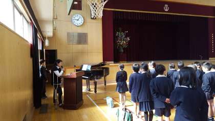 着任式に引き続き、始業式がありました。校長先生から新学年での目標を立てて、それに近づけるよう頑張ろうと話があり、転入生を紹介し、担任発表がありました。発表されるたびに拍手が起こりました。その後に校歌を斉唱しました。とても美しい声で歌っていました。