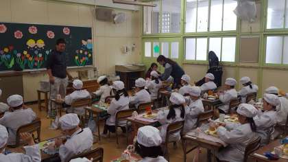 1年生の給食の様子です。6年生が、給食の運搬・配膳を手伝っています。配っている間、1年生は静かに待っていました。