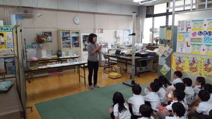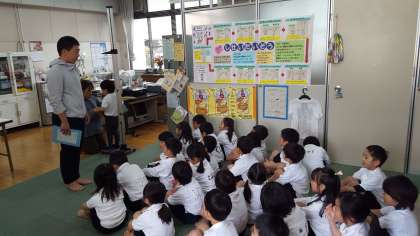 1年生が発育測定を行うために、初めて保健室に来ました。並び方を確認して、三角座りをして静かに話を聞いていました。